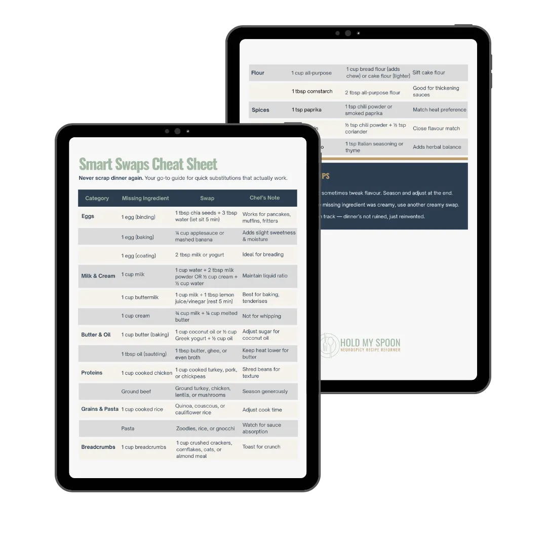 When something’s missing, most people panic, freeze, or give up. The Smart Swaps Guide shows you easy ingredient substitutions in seconds — so dinner keeps moving, even when your fridge doesn’t cooperate.